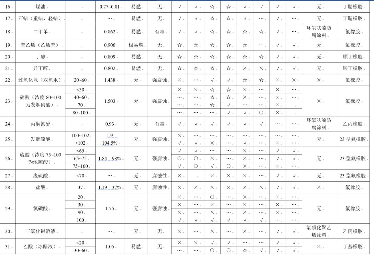 (1).罐體材料相容性符號含義:☆優(yōu)良;√良好;○可用但腐蝕較重;×不適用;…未知 (與溶體濃度、環(huán)境溫度有關(guān));