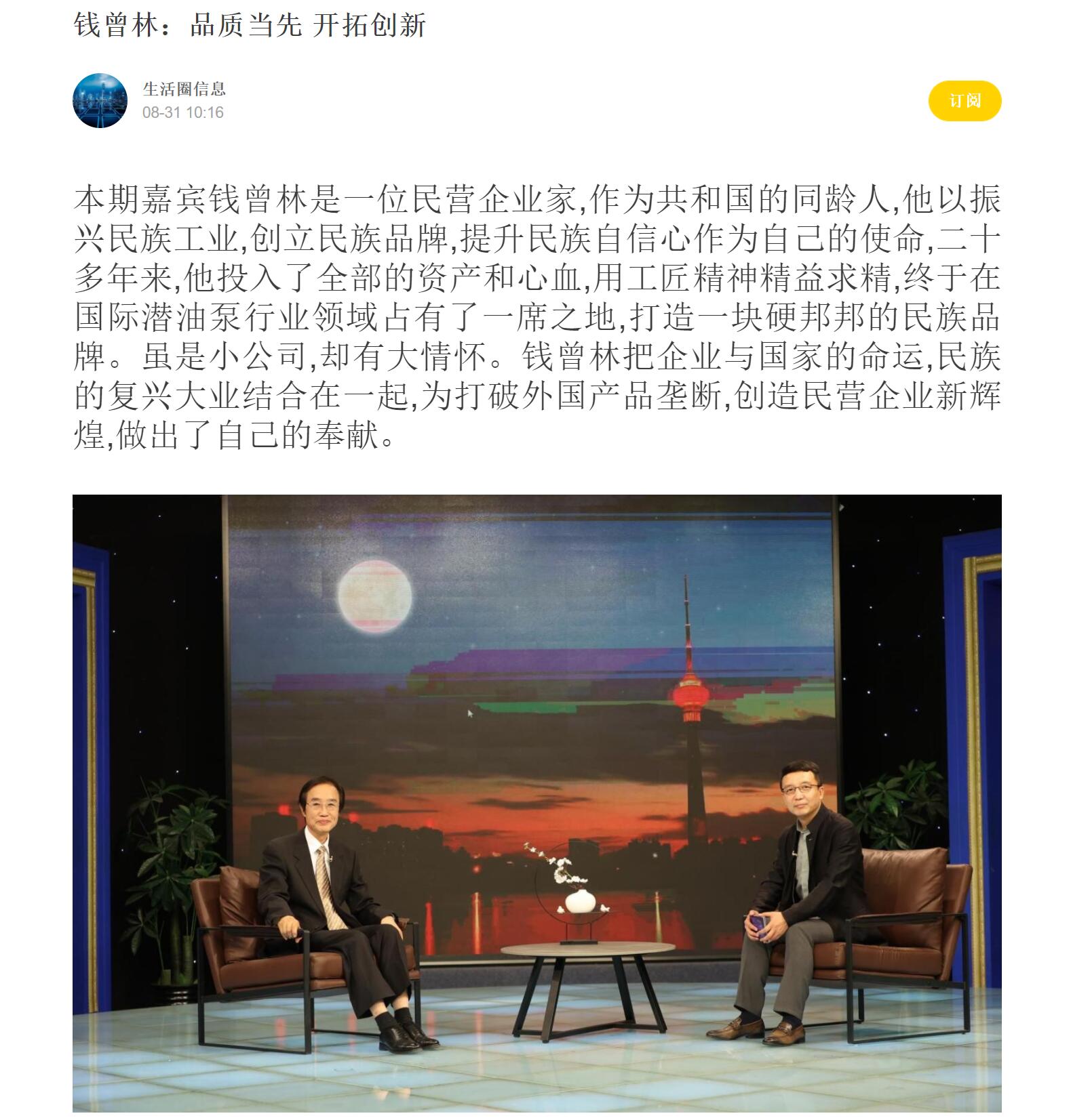 本期嘉賓錢曾林是一位民營企業(yè)家,作為共和國的同齡人,他以振興民族工業(yè),創(chuàng)立民族品牌,提升民族自信心作為自己的使命,二十多年來,他投入了全部的資產(chǎn)和心血,用工匠精神精益求精,終于在國際潛油泵行業(yè)領(lǐng)域占有了一席之地,打造一塊硬邦邦的民族品牌。雖是小公司,卻有大情懷。錢曾林把企業(yè)與國家的命運,民族的復(fù)興大業(yè)結(jié)合在一起,為打破外國產(chǎn)品壟斷,創(chuàng)造民營企業(yè)新輝煌,做出了自己的奉獻(xiàn)。