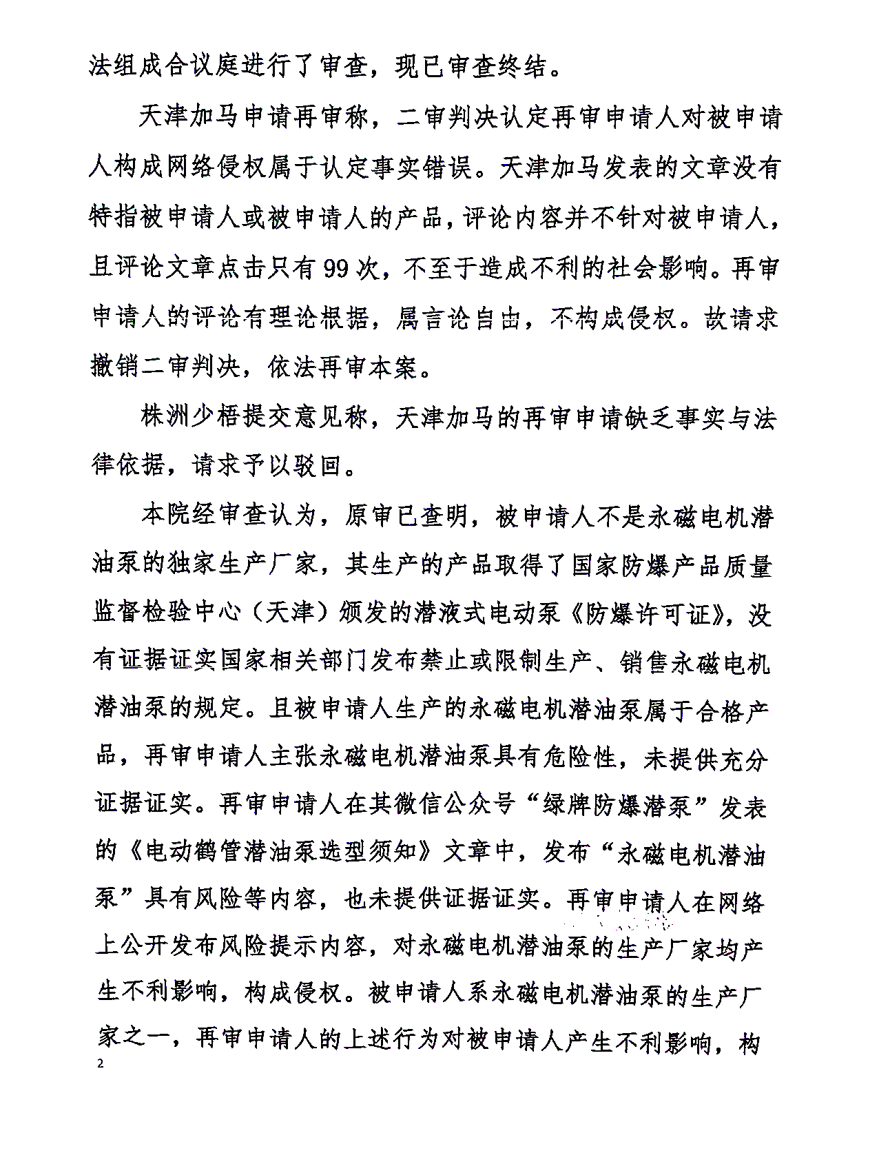 本院經(jīng)審查認(rèn)為,原審已查明,被申請人不是永磁電機(jī)潛油泵的獨(dú)家生產(chǎn)廠家,其生產(chǎn)的產(chǎn)品取得了國家防爆產(chǎn)品質(zhì)量監(jiān)督檢驗(yàn)中心(天津)頒發(fā)的潛液式電動泵《防爆許可證》,沒有證據(jù)證實(shí)國家相關(guān)部門發(fā)布禁止或限制生產(chǎn)、銷售永磁電機(jī)潛油泵的規(guī)定。且被申請人生產(chǎn)的永磁電機(jī)潛油泵屬于合格產(chǎn)品,再審申請人主張永磁電機(jī)潛油泵具有危險(xiǎn)性,未提供充分證據(jù)證實(shí)。再審申請人在其微信公眾號“綠牌防爆潛泵”發(fā)表的《電動鶴管潛油泵選型須知》文章中,發(fā)布“永磁電機(jī)潛油泵”具有風(fēng)險(xiǎn)等內(nèi)容,也未提供證據(jù)證實(shí)。再審申請人在網(wǎng)絡(luò)上公開發(fā)布風(fēng)險(xiǎn)提示內(nèi)容,對永磁電機(jī)潛油泵的生產(chǎn)廠家均產(chǎn)生不利影響,構(gòu)成侵權(quán)。被申請人系永磁電機(jī)潛油泵的生產(chǎn)廠家之一,再審申請人的上述行為對被申請人產(chǎn)生不利影響,構(gòu)成侵權(quán)。而點(diǎn)擊量的多少僅是不利影響及侵權(quán)程度的大小,并非不構(gòu)成侵權(quán)的抗辯理由。故再審申請人以被申請人非獨(dú)家生產(chǎn)廠家及點(diǎn)擊量少為由,主張不構(gòu)成侵權(quán)的理由不能成立,本院不予支持。